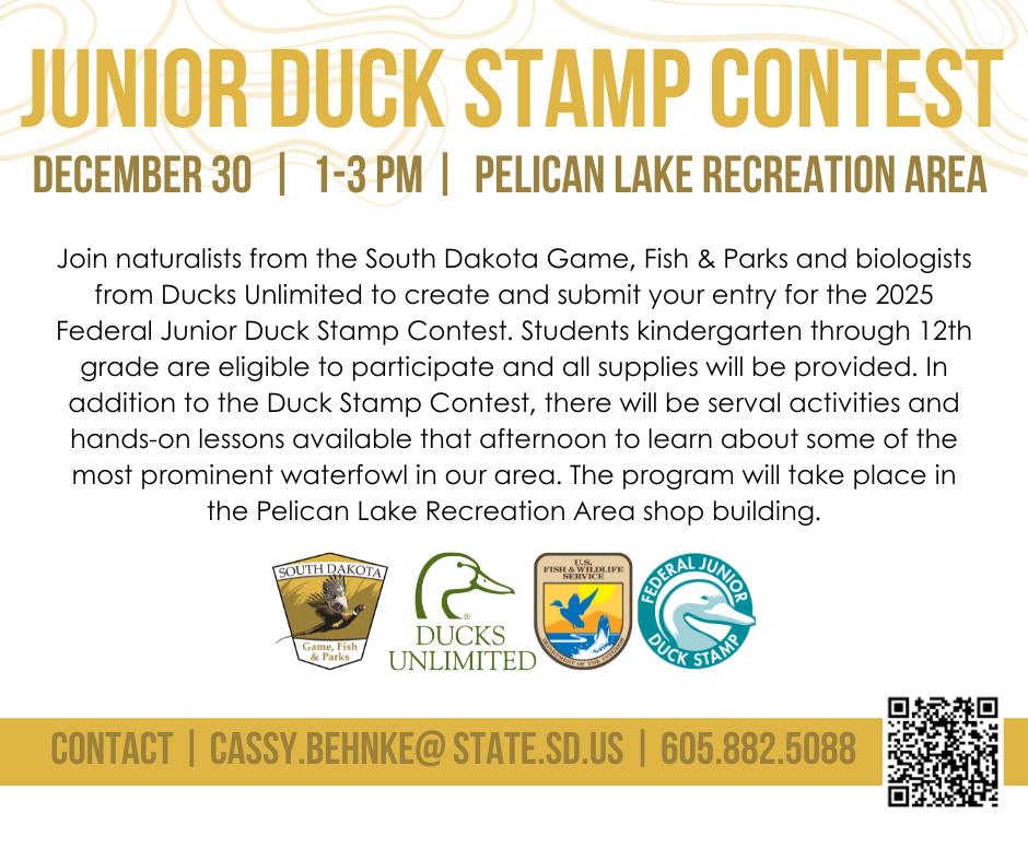Join naturalists from the South Dakota Game, Fish & Parks and biologists from Ducks Unlimited to create and submit your entry for the 2025 Federal Junior Duck Stamp Contest. Students kindergarten through 12th grade are eligible to participate and all supplies will be provided. In addition to the Duck Stamp Contest, there will be several activities and hands-on lessons available that afternoon to learn about some of the most prominent waterfowl in our area. The program will take place in the Pelican Lake Recreation Area shop building. Registration is required.